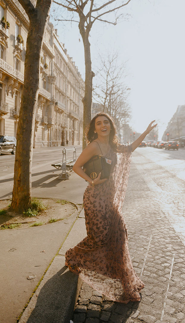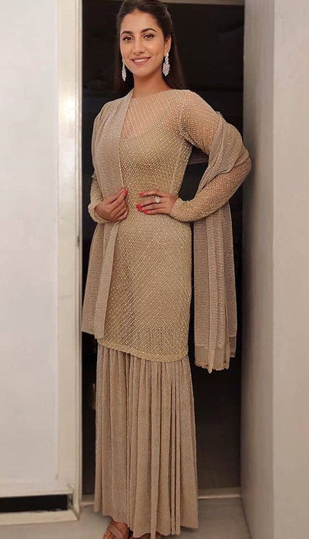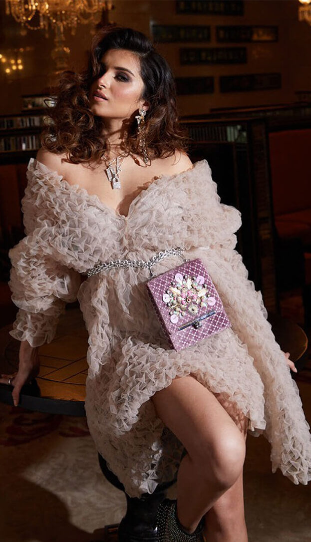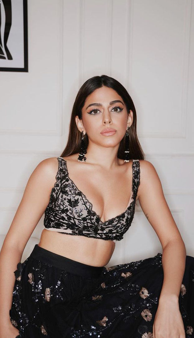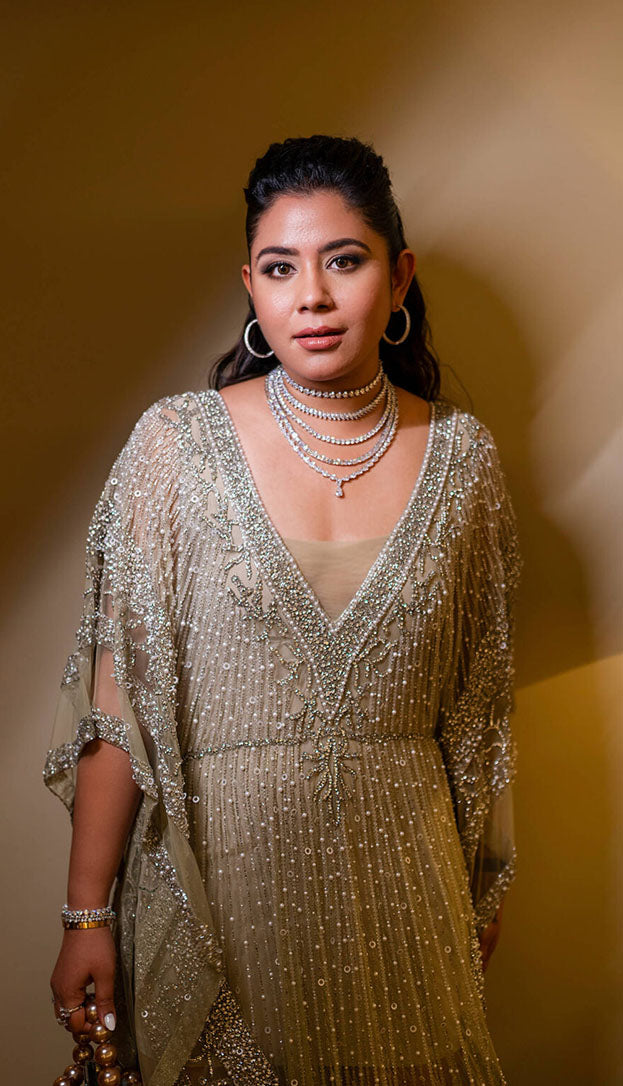 Divya C Mathur in our Nude Natasha Lehenga With Beaded Blouse And 3D Faux Feathers
