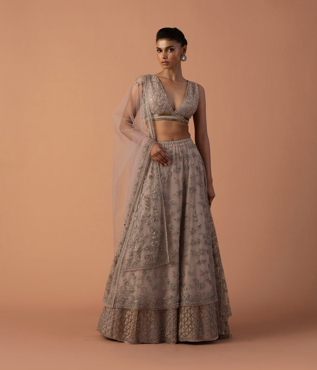 Grey Silk Organza Lehenga With Swarovski Stones And Bugle Beads, High Neck Blouse And Dupatta